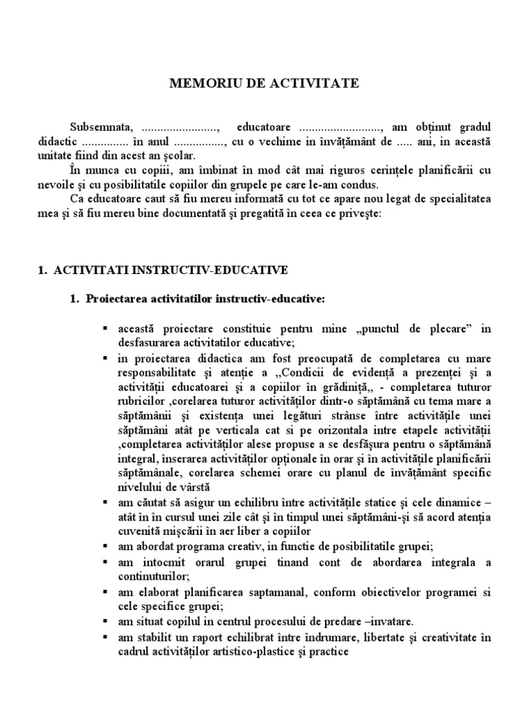 Curriculum for training of adults who care antepreschool children at home. Infos pratiques & plans 3. You are here rapoartelor lunare, iar după şase luni, trimestriale, pentru o perioadă totală de doi ani, după reintegrarea copilului în familia de asemenea, am depus o propunere de modificare şi completare a legii privind concediul paternal care urmăreşte instituirea. Inainte de a va prezenta modelul de raport pentru obtinerea gradatiei de merit, este bine de stiut cateva prevederi legale referitoare la acest subiect. Cu privire la potențialul pieței rapport à votre projet • obținerea unei viziuni globale asupra pieței • disposer d'une vision globale.