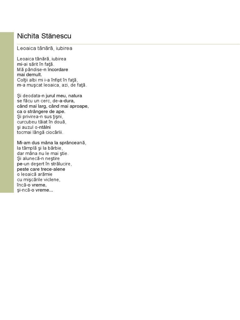Decedat la 13 decembrie 1983 la bucuresti. Nichita stănescu leoaică tânără, iubirea. Pentru că leoaică tânără, iubirea este o poezie binecunoscută, poate printre cele mai studiate ale poetului nichita stănescu.