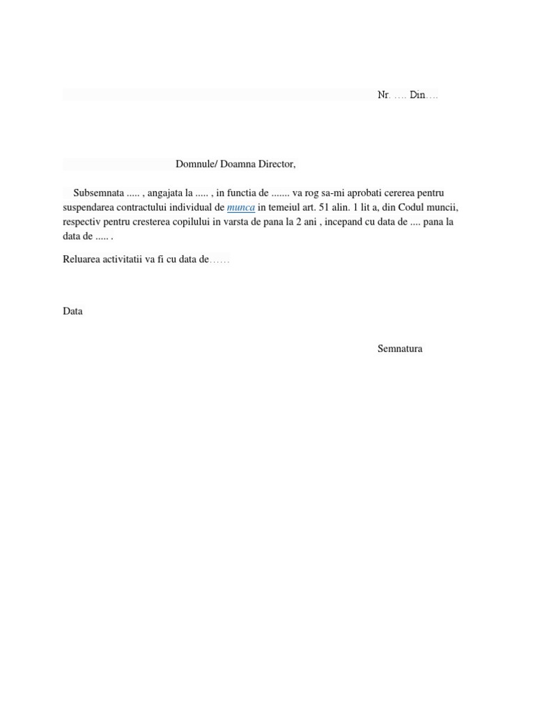 vizitati articolul complet aici : 2 Legislația din românia oferă facilități consistente mamelor sau taților care intră în concediul de creștere a copilului. Savesave model cerere concediu crestere copil for later. 51(1) litera a) din codul muncii, referitor la suspendarea contractului individual de muncă pentru cre terea copilului până la ….