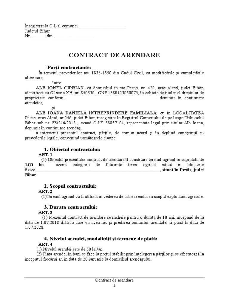 Părţile au convenit să încheie prezentul contract de arendare pe termen de …. Pentru a fi opozabile fata de terti contractele de arendare trebuie inregistrate in termen de 15 zile de la incheiere la consiliul local in a. In cazul in care, inainte de expirarea termenului contractului de arenda, intre partile contractului apar diverse interese care impiedica.